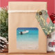 Pegatina con lancha motora en el agua azul turquesa del mar mediterráneo en la pequeña playa blanca de Cala Goloritze en el Golfo de Orosei, Cerdeña, Italia.