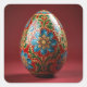 A vibrantly decorated Easter egg against a solid, deep red background and adorned with intricate floral patterns in shades of blue, green, and gold. Large, stylized blue flowers with golden centers are prominent, interspersed with delicate green leaves and swirling golden tendrils. The egg's surface has a glossy finish, reflecting the light and highlighting the rich colors and detailed artwork.