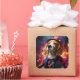 Un Beagle juguetón vestido con un disfraz vibrante y caprichoso contra un telón de fondo brillante y mágico. Este encantador diseño es perfecto para los amantes de los animales.