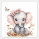 Une charmante illustration d’un bébé éléphant avec de grandes oreilles roses et des yeux expressifs. Il porte une délicate couronne de fleurs roses et de pêcher et se trouve au milieu d’un groupe de fleurs sauvages dans des tons d’orange, de rose et de jaune