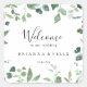 Este guion caligráfico boda follaje verde pegatina cuadrado de bienvenida es perfecto para un simple boda. El diseño presenta una acuarela de elegantes ramas y hojas de eucaliptos botánicos dibujadas a mano, dispuestas en hermosos ramos y motivos geométricos. Estas etiquetas son perfectas para los bolsos de bienvenida de los huéspedes del hotel y las bodas de destino.