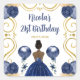 This birthday sticker features an elegant gold frame, a beautiful princess with dark skin and a navy blue dress, flowers and a balloon. This is perfect for a birthday party.
