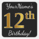Pegatina Cuadrada Black, Faux Gold 12th Birthday + Custom Name