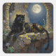 A black panther themed sticker. On the front is an illustration of a majestic black panther with fur like molten black and gold, laying on a cliff ledge bathed in ethereal moonlight. Intricate carvings adorn crumbling stone pillars, and bioluminescent flora casts a soft, otherworldly glow. The scene is rendered in a rich, textural oil painting style with thick, .