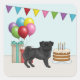 El original ilustracion personalizado de Destei de un adorable perro de raza Pug color abrigo negro. El perro está colocado en un entorno de colorido cumpleaños. Hay una torta de cumpleaños con algunas velas, globos de cumpleaños coloridos y una pancarta y dos cajas de regalo.