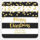 Texto personalizado pegatinas de Feliz Navidad con franjas blancas y negras y confeti de oro festivo.