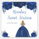 Este pegatina dulce de dieciséis años cuenta con flores florales color azul marino purpurina y una hermosa princesa con el pelo rubio y un vestido elegante. Es perfecto para una dulce fiesta de 16 años.