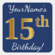 Pegatina Cuadrada Blue, Faux Gold 15th Birthday + Custom Name