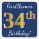 Este sencillo diseño de pegatina de cumpleaños incluye un mensaje como "¡Cumpleaños 34 de FirstName!", con el "34″ que tiene un aspecto de color falso/imitación de inspiración dorada, en un fondo de color azul. El nombre se puede personalizar. Pegatinas como estos podrían ser tal vez un regalo para alguien que esté celebrando su 34 cumpleaños, o tal vez podrían ser usados como decoraciones en una fiesta de cumpleaños. [~Z0000248]