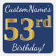 Pegatina Cuadrada Blue, Faux Gold 53rd Birthday + Custom Name