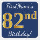 Este sencillo diseño pegatina de cumpleaños muestra un mensaje como "¡Cumpleaños 82 de FirstName!", con el "82" con un aspecto de color falso/imitación de inspiración dorada, en un fondo de color azul. El nombre se puede personalizar. Pegatinas como estos podrían ser tal vez un regalo para alguien que esté celebrando su cumpleaños número ochenta, o tal vez podrían ser usados como decoraciones en una fiesta de cumpleaños. [~Z0000248]