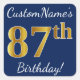 Pegatina Cuadrada Blue, Faux Gold 87th Birthday + Custom Name