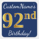 Pegatina Cuadrada Blue, Faux Gold 92nd Birthday + Nombre personaliza
