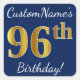 Pegatina Cuadrada Blue, Faux Gold 96th Birthday + Custom Name