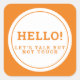 Boda de distancia social ámbar hola pegatina. Ayude a sus huéspedes a sentirse seguros y haga saber a los demás clientes que los necesitan para mantenerse alejados y protegerse a sí mismos o a los clientes más vulnerables. El pegatina del boda ámbar-naranja de código lee ¡Hola! Hablemos pero no toquemos. Ideal para añadir a un kit de boda de seguridad de virus invitado o kit de eventos. También están disponibles posters e instrucciones coincidentes. Diseñado por www.mylittleedenweddings.com
