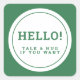 Boda de distancia social, pegatina de saludo verde. Ayude a sus huéspedes a sentirse seguros y haga saber a otros clientes que está contento con el contacto. ¡El pegatina de boda verde del código dice Hola! Habla y abraza, si quieres. Ideal para añadir a un kit de boda de seguridad de virus invitado o kit de eventos. También están disponibles posters e instrucciones coincidentes. Diseñado por www.mylittleedenweddings.com