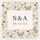 Pegatina cuadrada de boda floral boho. Elegante y romántica, esta hermosa paleta de colores de beige, marrón, óxido, terracota y naranja quemada es el tema de moda para las bodas de este año. La hierba seca rústica, las hermosas flores, las mariposas lindas y las flores silvestres vintage son detalles impresionantes para tu boda moderna boho-chic. Encuentra artículos coincidentes en el conjunto de invitaciones de boda Boho Wildflower.