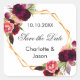 Un pegatina Guardar la fecha. Marco geométrico falso de color dorado con rosas bohemias, boho acuático, flores de burdeos y rosa. Personalice y agregue sus nombres, fecha del boda.