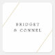 Sencillos y modernos stickers de bodas con dos falsas líneas doradas, uno en la parte superior izquierda y otro en la parte inferior derecha, sobre un fondo blanco. En el centro están tus nombres. Un diseño minimalista y elegante, ideal para la pareja minimalista. Estos pegatinas son perfectos para sellar los sobres.