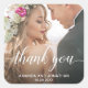 Esta pegatina cuadrada es una encantadora elección para favores matrimoniales y correspondencia, y cuenta con un estilo de letra moderno con texto de "gracias" y una plantilla de texto para que añada los nombres, fecha de boda u otro texto deseado. Se proporciona una plantilla de fotografía de ejemplo para que subas la foto deseada en su lugar. Este pegatina está disponible en 2 tamaños: Grande: 3" x 3" w, 6 pegatinas por hoja o Pequeño: 1,5" x 1,5" w, 20 pegatinas por hoja.