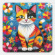 Pegatina Cuadrada Boho Folk Art Cat, Flowers & Butterfly