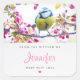 Pegatinas de cocina con una sorprendente fotografía del pequeño pájaro más lindo encaramado en una rama cubierta de flores rosas y hojas verdes. El pájaro tiene la cabeza azul y el cuerpo amarillo con una cara muy dulce. Adorable.