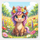 Un adorable pony con un anillo de flores moradas y rosas en la cabeza. Un ilustracion de aire dulce y caprichoso que es luminoso y colorido en rosa, azul, amarillo y violeta.
