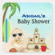Este lindo diseño de pegatina Baby Shower de playa para niños incluye un lindo bebé de playa bebiendo su limón. Está parado con sus amigos del mar con un cangrejo y una estrella de mar, un impresionante castillo de arena y su tabla de surf. Se puede personalizar con un nombre y cualquier texto que desee agregar. Algunos gráficos de artwork©delightful-doodles.com y CherylSeslarDesigns.com en DigiWebStudio.com.