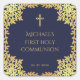 Este elegante diseño religioso azul marino y dorado con aire vintage, recomendado para una primera comunión de niños, tiene un marco de Relieve metalizado falso dorado ornamentado con ramas intrincadas con hojas sobre un fondo azul marino. Encima del texto hay una cruz religiosa, también en falso Relieve metalizado de oro. El texto es dorado. El marco vintage de hojas ornamentadas se basa en un enlace de portada de libros antiguos, "The XVIII Century its Institutions, Personalizados, and Costumes" de Paul LaCroix, publicado en 1876, ahora de dominio público.