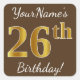 Este sencillo diseño pegatina de cumpleaños incluye un mensaje como "¡Cumpleaños 26 de tu nombre!", con el "26" con un aspecto de color falso/imitación de inspiración dorada, en un fondo de color marrón. El nombre se puede personalizar. Pegatinas como estos podrían ser tal vez un regalo para alguien que esté celebrando su 26º cumpleaños, o tal vez podrían ser usados como decoraciones en una fiesta de cumpleaños. [~Z0000249]