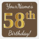 Este sencillo diseño pegatina de cumpleaños incluye un mensaje como "¡El cumpleaños 58 de tu nombre!", con el "58" que tiene un aspecto de color falso/imitación de oro, con un fondo de color marrón. El nombre se puede personalizar. Pegatinas como estos podrían ser tal vez un regalo para alguien que esté celebrando su cincuenta y ocho cumpleaños, o tal vez podrían ser usados como decoraciones en una fiesta de cumpleaños. [~Z0000249]