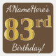 Este sencillo diseño pegatina de cumpleaños muestra un mensaje como "¡El 83 aniversario de ANameHere es el 83 aniversario!", con el "83" con un aspecto de color falso/imitación de inspiración dorada, sobre un fondo de color marrón. El nombre se puede personalizar. Pegatinas como estos podrían ser tal vez un regalo para alguien que esté celebrando su cumpleaños número ochenta, o tal vez podrían ser usados como decoraciones en una fiesta de cumpleaños. [~Z0000249]