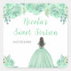 This sweet sixteen sticker features faux glitter mint green floral flowers and a beautiful princess with brown hair and an elegant dress. This is perfect for a sweet sixteen birthday party.