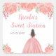 This sweet sixteen sticker features faux glitter pink floral flowers and a beautiful princess with brown hair and an elegant dress. This is perfect for a sweet sixteen birthday party.