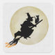 Silueta de bruja sobre un palo de escoba con fuego saliendo de la escoba y un gato negro encaramado sobre la manija contra una luna llena redonda.