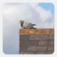 Una foto de una paloma colgada en el ápice de un techo en un soleado día de invierno.