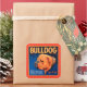 Impresión de una etiqueta vintage de la caja que ilustra un bulldog con un fondo con estampado azul y un borde naranja. Elija esta impresión de arte en su producto Zazzle hoy.