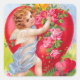 Hermosos pegatinas vintage con un hermoso cherub con rosas frente a un corazón ardiente, pintado por la ilustradora/artista comercial estadounidense Ellen Hattie Clapsaddle.