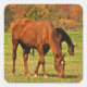 Estos pegatinas presentan una fotografía artística de un hermoso paisaje rural de otoño con caballos pastoreando el césped verde. Detrás de ellos se alza una colina con gloriosos colores otoñales de rojo, naranja, oro, amarillo, marrón y verde.