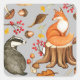 El pegatina temático de los bosques del otoño presenta zorro y batidor con hojas, bayas, setas y bellotas sobre fondo gris claro.