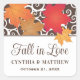Los pegatinas en favor de la boda temática de otoño presentan un patrón de movimientos de remolinos y hojas de arce sobre el texto "Caer en amor" del personalizable y un monograma de los nombres de la novia y el novio y la fecha del boda. Los ricos colores otoñales incluyen naranja, rojo, cobre, oro y marrón chocolate. Marfil / fondo crudo.