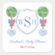 Este diseño clásico de calcomanía de favor / agradecimiento presenta un simple crestón de monograma de 3 letras flanqueado a ambos lados por una bola de topiaria pintada a mano en una maceta de jarrón de jengibre adornada con un lazo de Estrellas y Barras. Los elementos de acuarela fueron pintados por mí en papel de algodón 100% y escaneados en forma digital. La forma del crestón es de otro artista. Este diseño funcionaría igualmente bien para un baby shower (donde se ha anunciado el nombre del bebé) o para una ducha de boda / parejas.