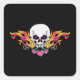Calavera malvada con colmillos y llamas y corazones de muchacha rosada.