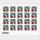 A cute calico cat sitting with a poinsettia flower and snowflakes in blue and red holiday stickers. Super cute to seal your Christmas cards with.