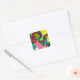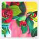 Original acuarela de flores rojas camellias florales con follaje verde contra un colorido fondo rosa y amarillo vibrante. Por la artista Sacha Grossel, este diseño de flores botánicas es impresionante.