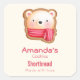 Pegatinas de productos de negocios con una cara de oso adorable y adorable sobre una base de galletas. Llevando una bufanda de rayas rojas y blancas.