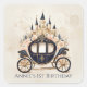 Este elegante diseño cuenta con un carruaje femenino de cuento de hadas de azul marino con un castillo de princesa detrás adornado con flores rosas rubias.
