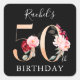 Etiqueta cuadrada de celebración de cumpleaños 50 dorado script que se puede personalizar con la inclusión del nombre de la cumpleañera. Estas etiquetas se pueden utilizar para envolver regalos o sellar sobres cuando se envían las invitaciones.