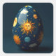 A dark blue, glossy Easter egg is adorned with a celestial pattern. The design features a prominent, anthropomorphic sun with a human face and fiery rays at the center. Scattered around the egg are various planets, stars, and fluffy white clouds, all rendered in a vintage, illustrative style.