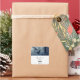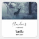 Velas, jabón, artesanías o pegatinas de productos de cocina con una foto de un venado de regal con cuerdas paradas en un bosque oscuro entre árboles iluminados por el sol. Nieve por todas partes.